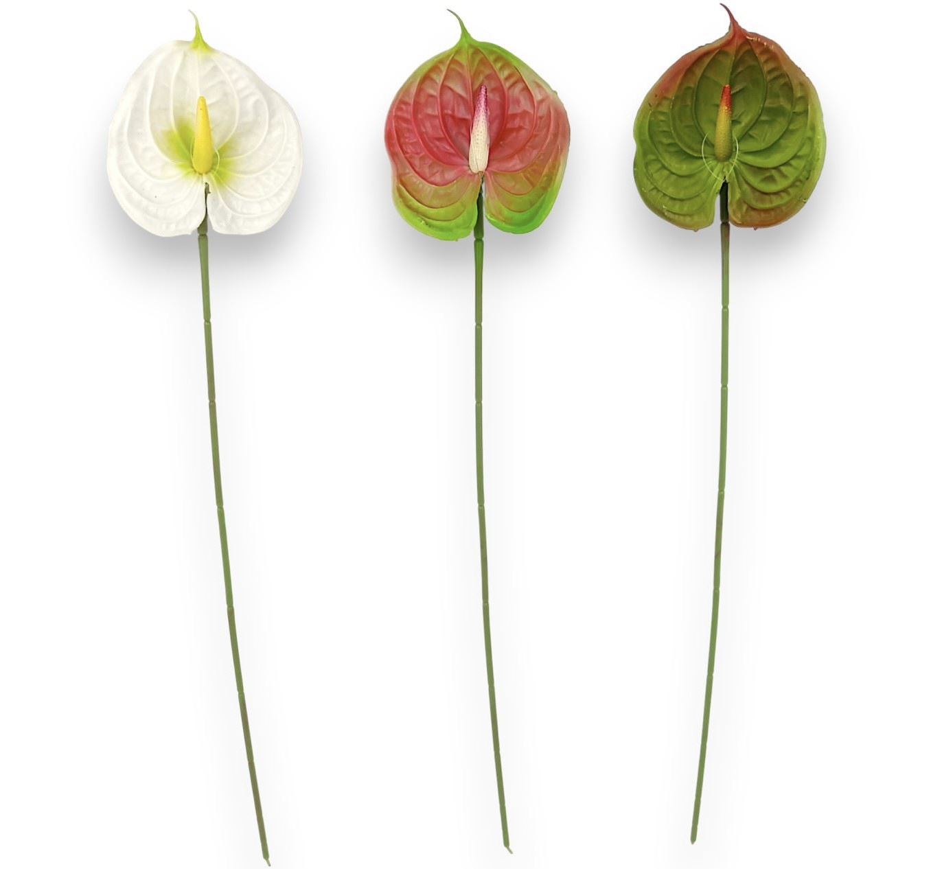 Антуріум, відомий також як «Чоловіче щастя» або «Квітка фламінго» — це символ сили, пристрасті та фінансового процвітання. Наша штучна копія серії Real Touch створена з використанням новітніх полімерів, що дозволяють відтворити найменші деталі живої природи. Глянцеве, серцеподібне «покривало» квітки має шкірясту структуру, а витончений початок (серединка) пофарбований з натуральним градієнтом.