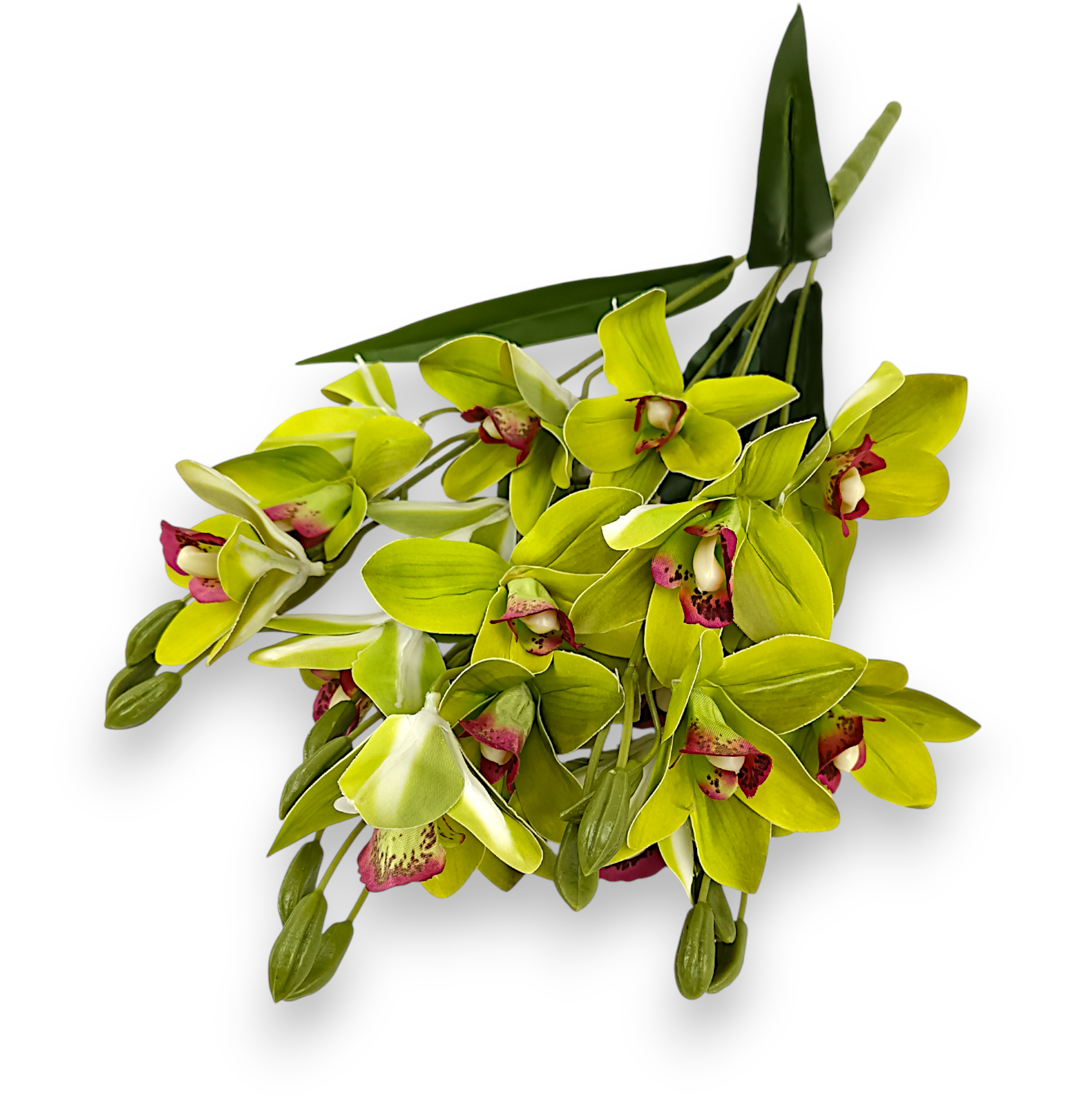 Вишуканий букет орхідеї Цимбідіум висотою 45 см, виготовлений з матеріалу преміум-класу (сенсорний латекс/силікон). Квіти належать до категорії Real Touch: м’ясисті пелюстки прохолодні на дотик і повністю імітують структуру живої тропічної рослини. Компактний та пишний букет, що додасть статусности будь-якому інтер’єру.