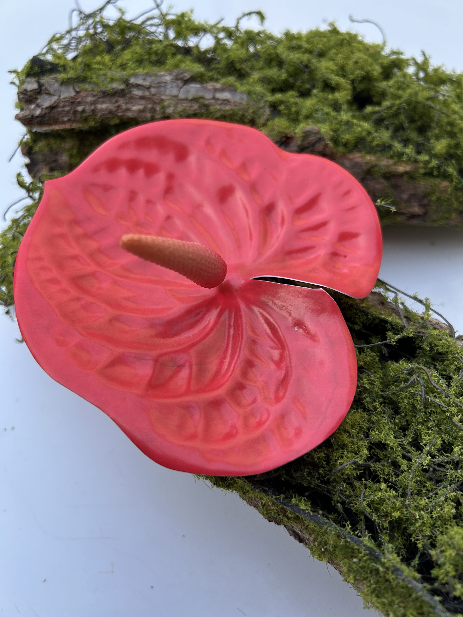 Центральний початок (тичинка) виконаний із високою деталізацією, з плавним переходом кольору, що додає квітці об’єму та життя. Антуріум, відомий у народі як «Чоловіче щастя», символізує силу, пристрасть та успіх, тому цей декор виглядає дорого і статусно.