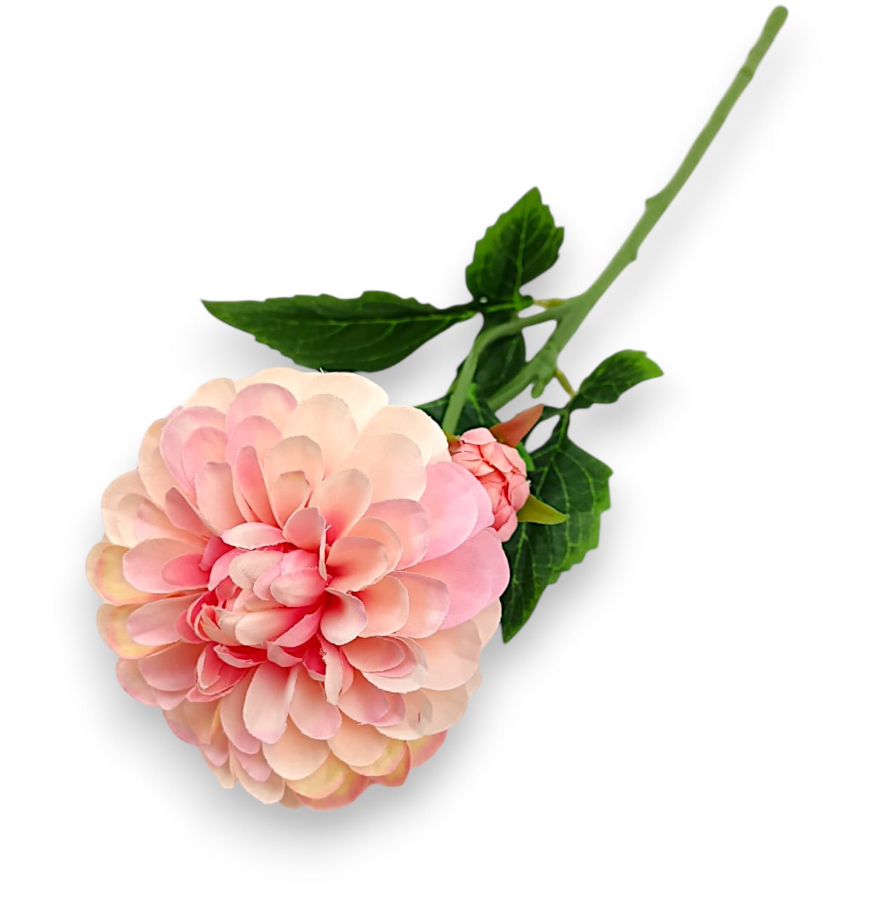 Ефектна гілка штучної жоржини (далії) з одним великим, пишним бутоном та фігурним зеленим листям. Квітка вирізняється складною геометрією та безліччю акуратних пелюсток, які створюють неймовірний об’єм. Це виразний та самодостатній елемент декору, який додасть фактурності та кольору будь-якій флористичній композиції.