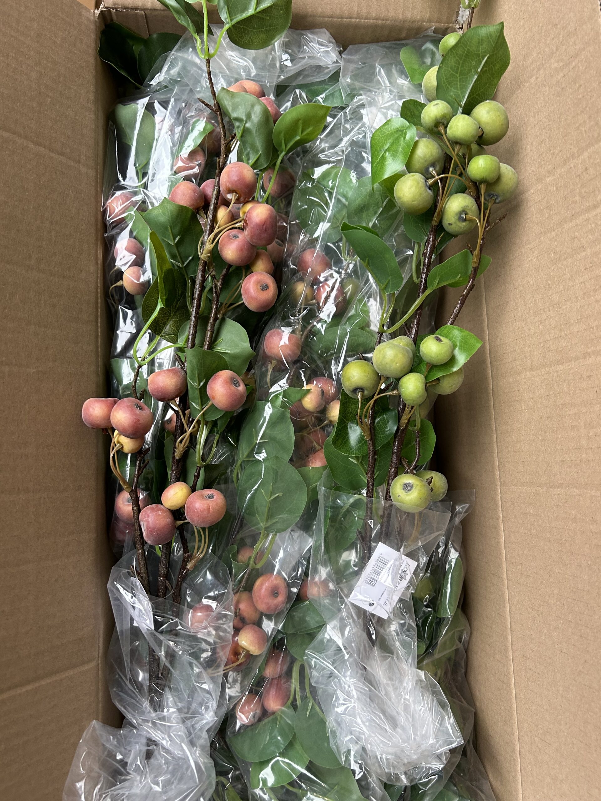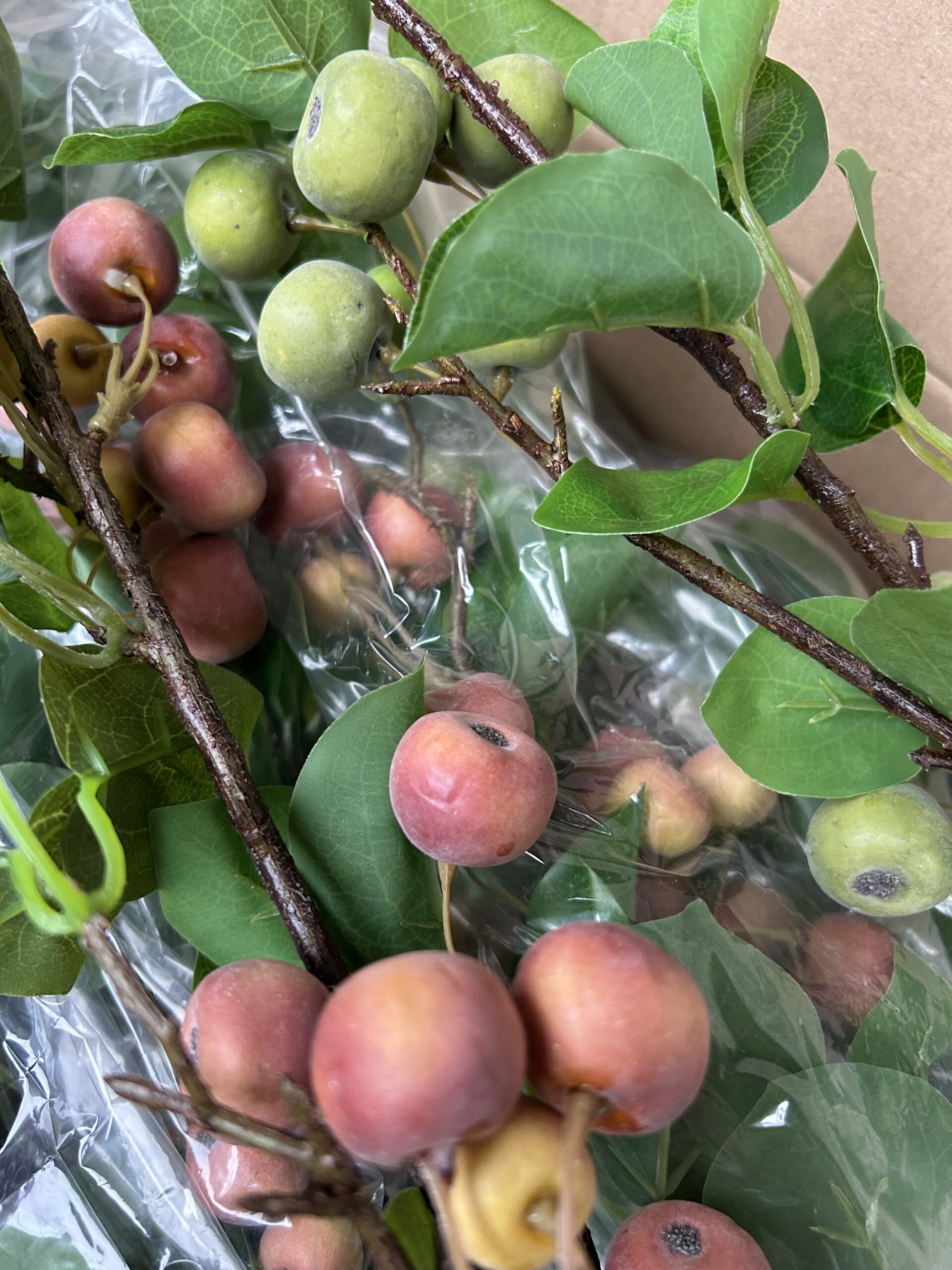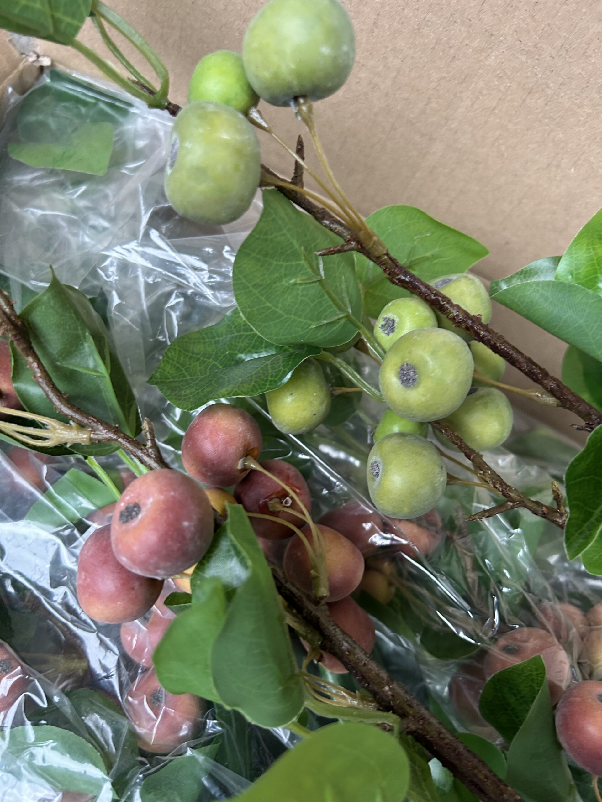 Декоративні китайські яблучка — це улюблений матеріал флористів та декораторів у осінньо-зимовий сезон. Ці маленькі, апетитні фрукти виглядають так, ніби їх щойно зірвали з казкового дерева. Глянцева поверхня гарно відбиває світло гірлянд, додаючи композиціям урочистості та затишку.
