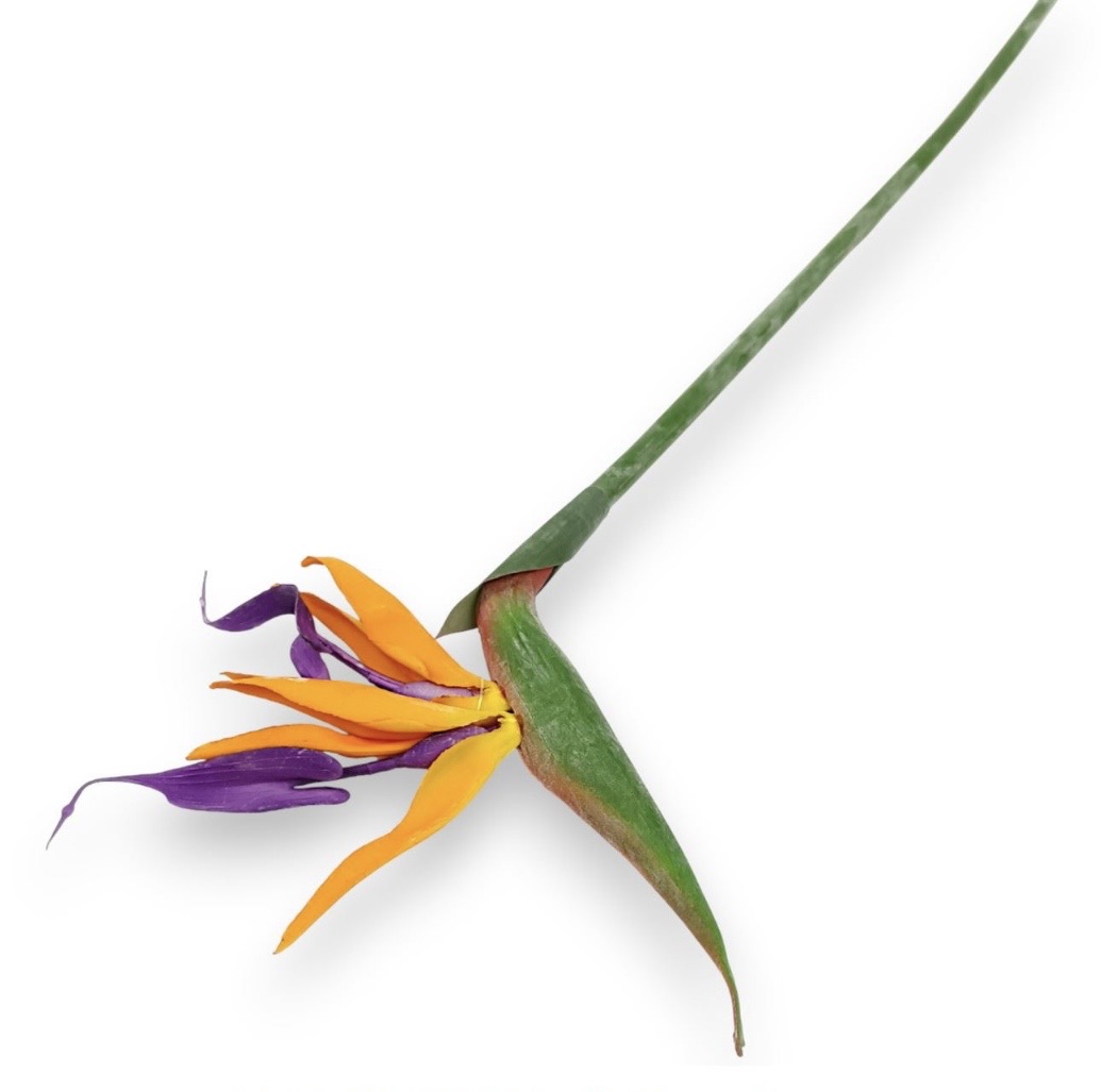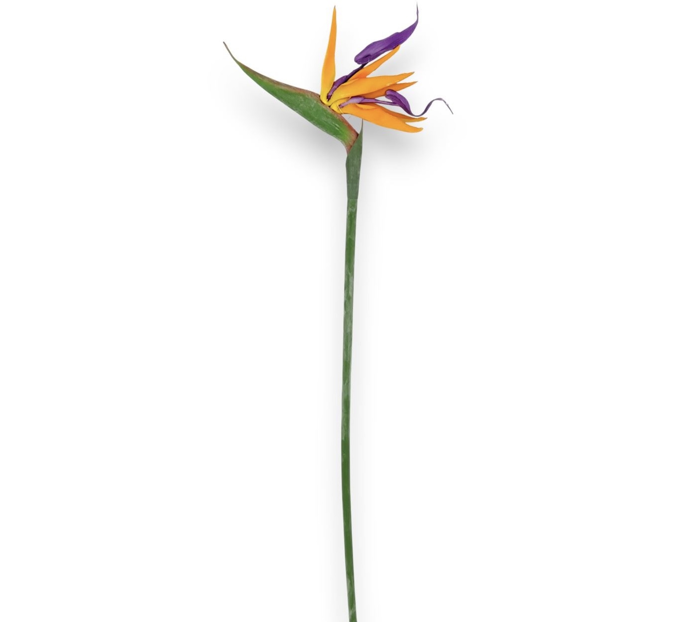 Ефектна гілка стреліції з яскраво-помаранчевим суцвіттям, що нагадує голову екзотичного птаха. Виготовлена зі щільного сенсорного латексу, який на дотик і вигляд ідентичний живій рослині. Ідеальний вибір для створення вертикальних акцентів у сучасних інтер’єрах та підлогових вазах.