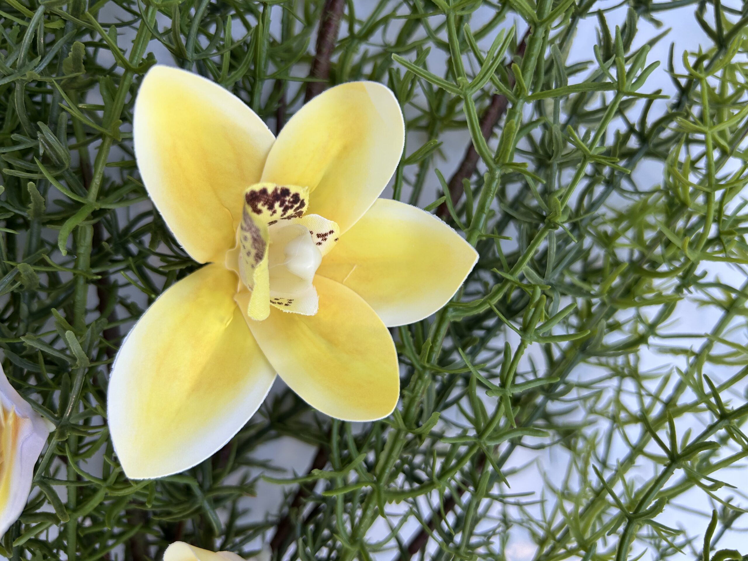 Голова цимбідіума штучна — це реалістична декоративна квітка преміум-класу, яка відтворює природну красу живого орхідеєвого цимбідіума. Завдяки якісному текстильному матеріалу пелюстки мають природну форму, легку фактуру та природний блиск, що забезпечує максимально натуральний вигляд у будь-якій композиції.