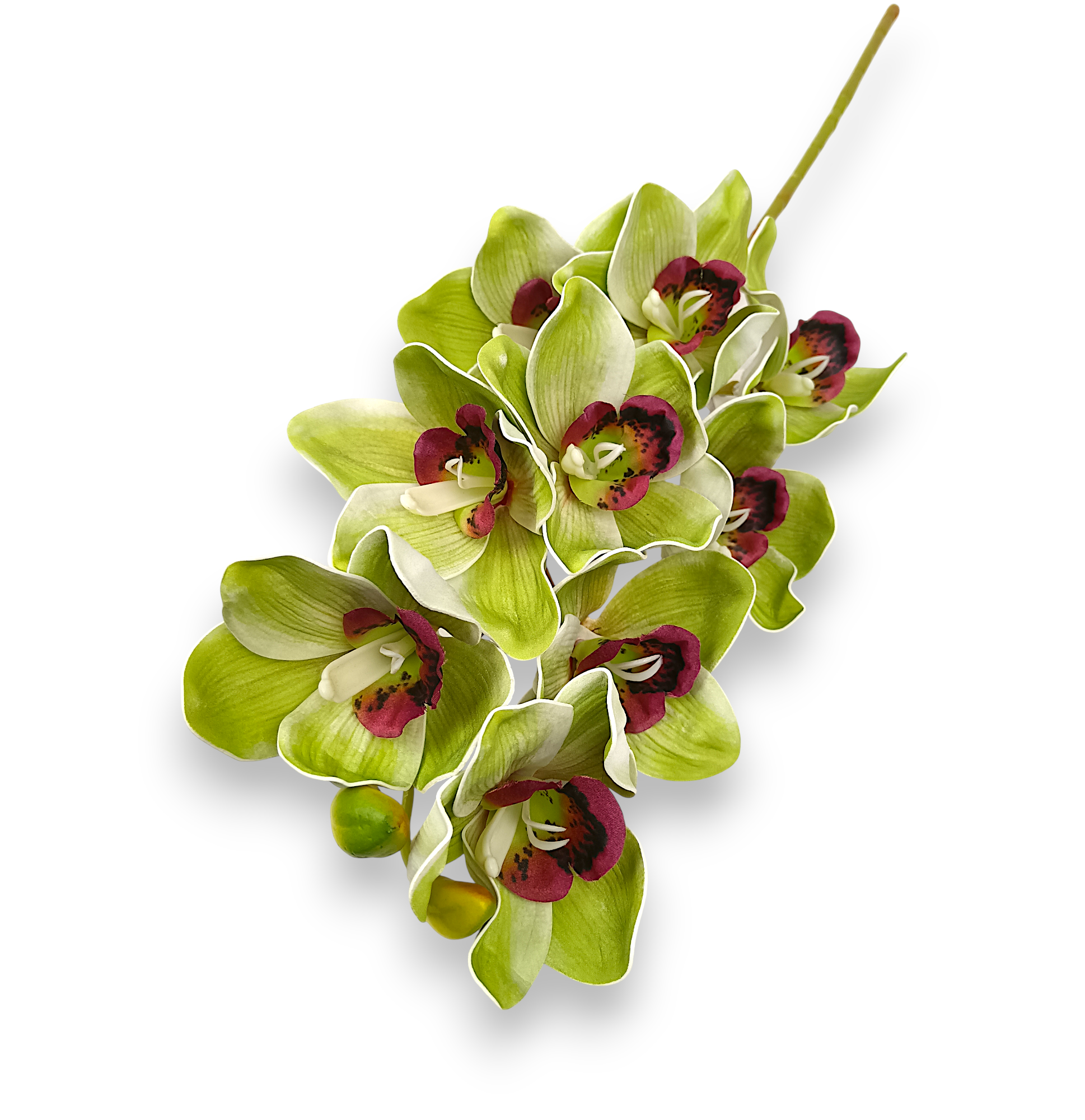 Цимбідіум — один із найвишуканіших видів орхідей, який цінується флористами та декораторами за великі суцвіття та неймовірну елегантність. Наша штучна копія передає цю природну красу з абсолютною ботанічною точністю. Кожна квітка на довгому 80-сантиметровому стеблі має характерну форму, контрастну “губу” (серединку) та витончені пелюстки.