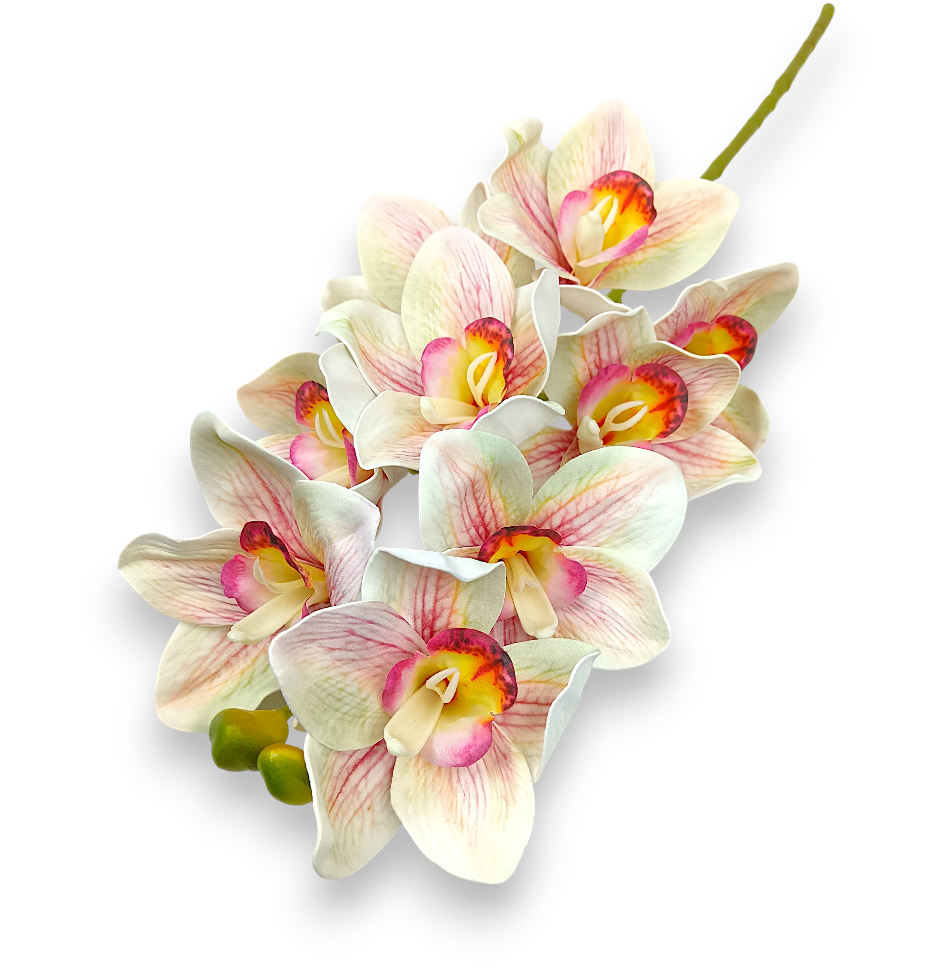 Цимбідіум — один із найвишуканіших видів орхідей, який цінується флористами та декораторами за великі суцвіття та неймовірну елегантність. Наша штучна копія передає цю природну красу з абсолютною ботанічною точністю. Кожна квітка на довгому 80-сантиметровому стеблі має характерну форму, контрастну “губу” (серединку) та витончені пелюстки.
