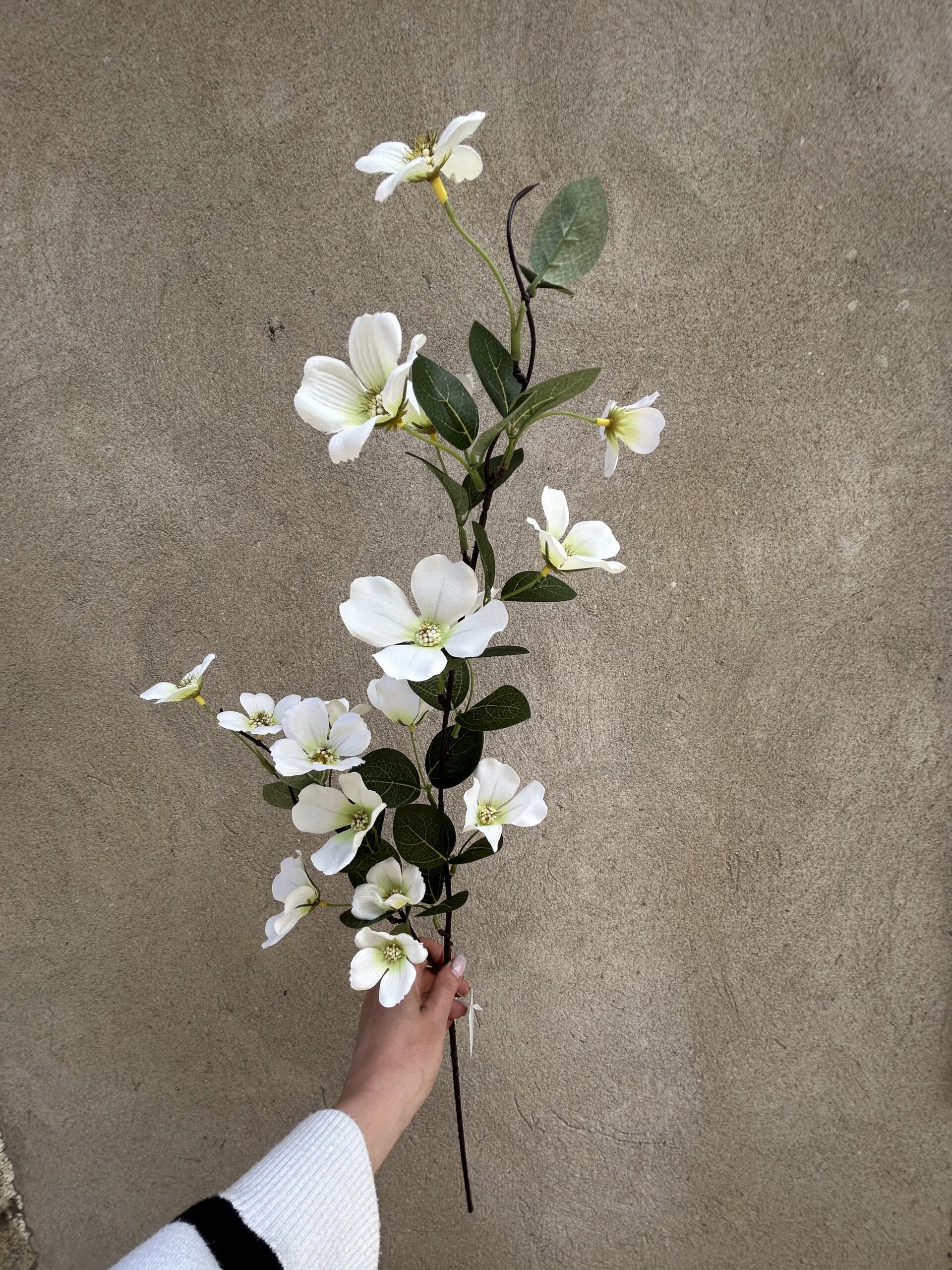 Гілка довжиною 80 см має міцну дротяну основу, від якої відходять менші пагони. Це дозволяє легко моделювати її форму: ви можете залишити гілку прямою для класичної високої вази або грайливо зігнути її, імітуючи природне спадання пагонів квітучого куща.